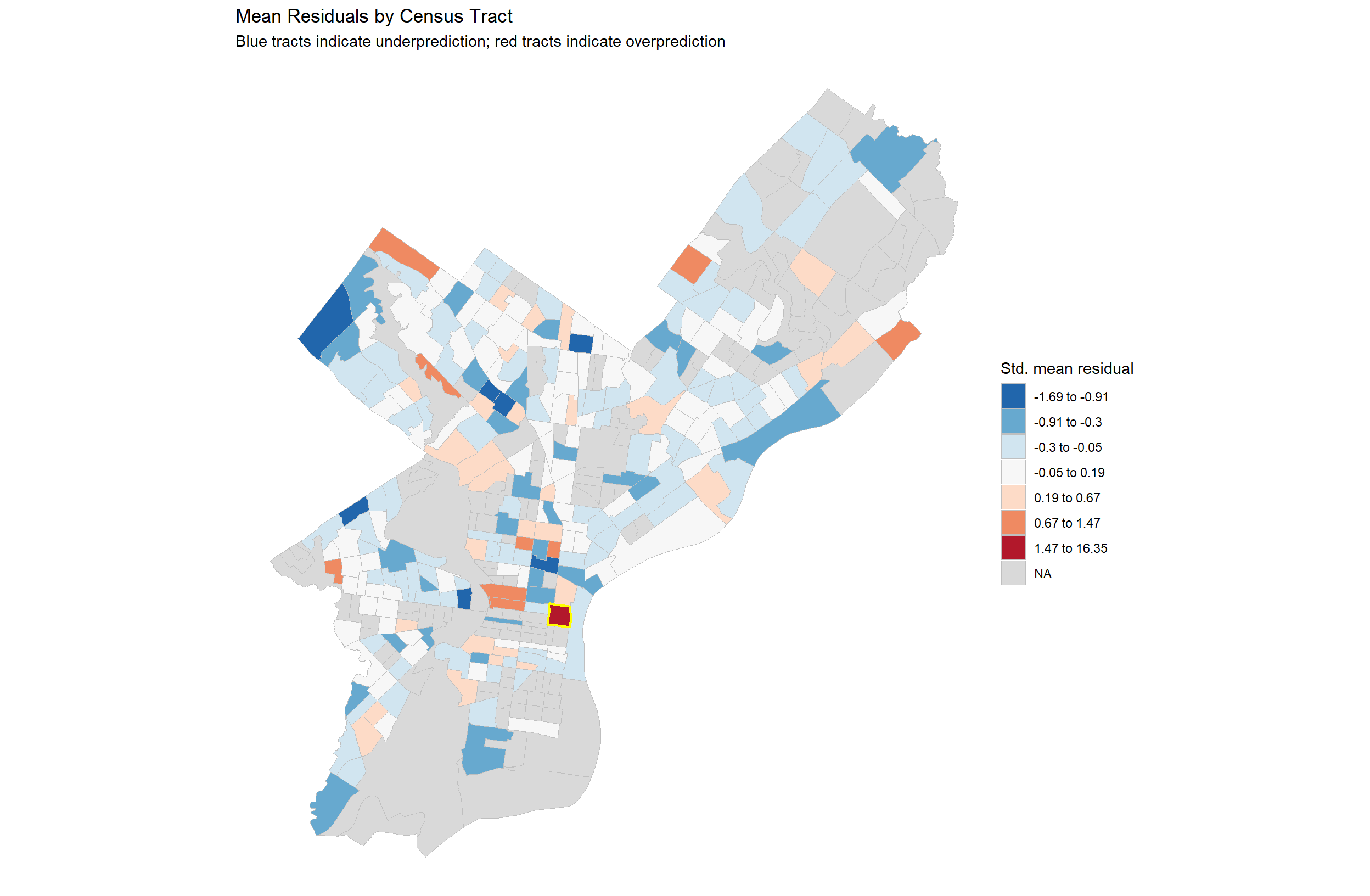 Census Tract 1, highlighted in yellow, has the largest residual, which means it is the hardest neighborhood for the model to predict accurately and that prices there are often underpredicted.
